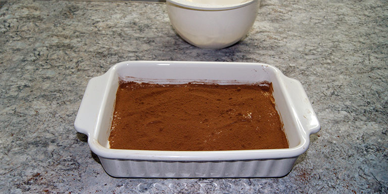 Du kan välja att pudra Tiramisún med cacao innan du ställer in den i kylen eller också pudrar du den strax före servering för ett extra vackert cacaolager