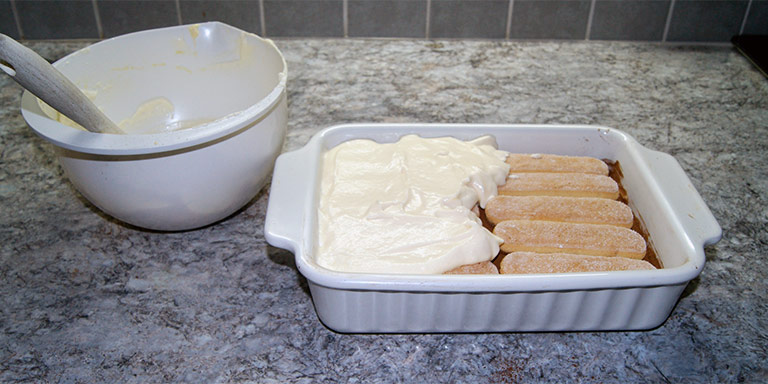Lägg sedan ytterligare ett varv med kaffedoppade savoiarkex och fördela därefter resterande mascarponikräm över dessa